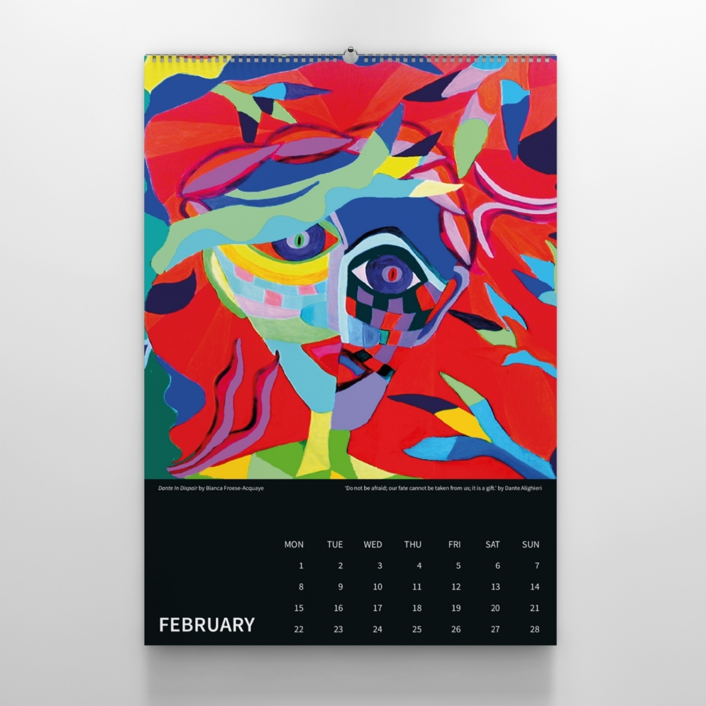 This limited calendar with its beautiful big-sized calendar sheets will accompany you through the Dante year. In future, March 25th will be declared 'Dante Day' in Italy in his honor. The calendar shows photos of TD's opera performance 'Dante's Inferno' at Burg Nideggen in Germany, as well as wonderful painted artwork of Bianca Froese-Acquaye's Dante Series. Original quotes of Dante Alighieri himself complete the calendar perfectly.